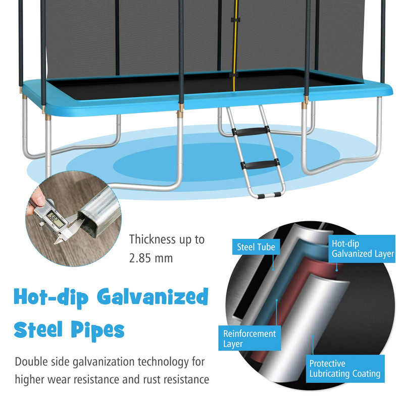 - Hot-dip Galvanized Steel & Stable Structure: The 8FT x 14FT rectangular trampoline is constructed with hot-dip galvanized steel pipes which also apply double-side galvanization technology for higher wear resistance and rust resistance. In addition, there are 4 U-shaped legs with non-slip foot pads and a ladder with non-slip steps for a more stable structure and safer user experience.